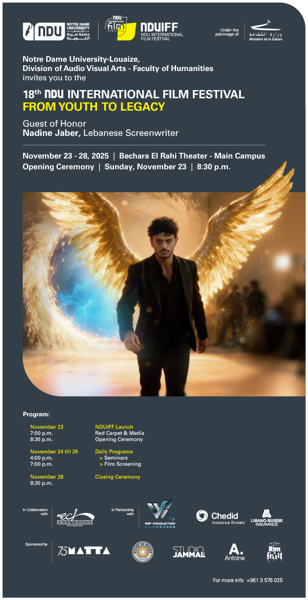 The Division of Audio Visual Arts at Notre Dame University-Louaize (NDU), under the Faculty of Humanities, proudly announces the 18th edition of the NDU International Film Festival (NDUIFF), held under the theme “From Youth to Legacy.” Taking place from November 23 to 28, 2025, at the Bechara El Rahi Theater on the NDU Main Campus, the festival continues its longstanding mission to celebrate emerging cinematic talent and examine its growing impact on regional and international film culture.
