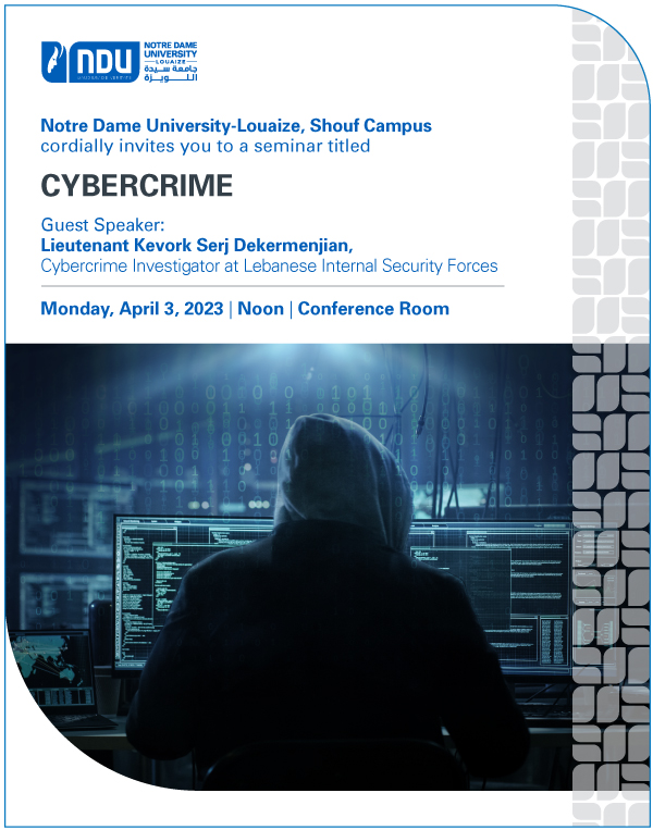 Lieutenant Kevork Dekermenjian, Cyber Crime Investigator at the Lebanese Internal Security Forces will share his expertise on cybercrimes among higher education students with respect to various variables, on Monday, April 3, 2023, at the Shouf Campus.