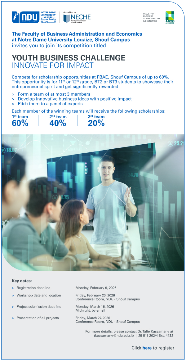 The Faculty of Business Administration and Economics (FBAE) at Notre Dame University-Louaize, Shouf Campus is pleased to announce the upcoming Youth Business Challenge: Innovate for Impact, an initiative designed to foster innovation, creativity, and entrepreneurial thinking among high school and technical students. This competition invites 11th and 12th grade, BT2, and BT3 students to form teams of up to three members and develop innovative business ideas that create meaningful social and economic impact.