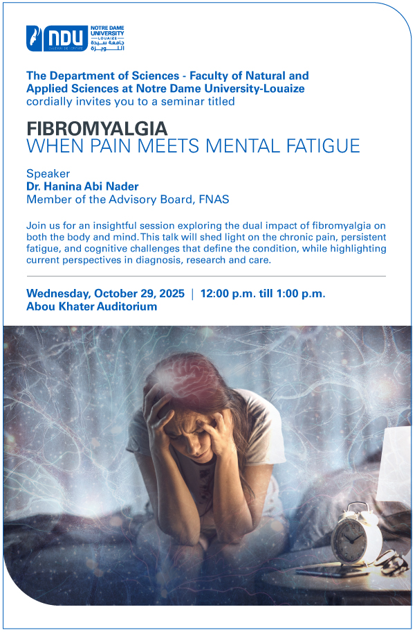 The Department of Sciences at the Faculty of Natural and Applied Sciences, Notre Dame University-Louaize (NDU), cordially invites the university community to attend a seminar titled “Fibromyalgia: When Pain Meets Mental Fatigue”, presented by Dr. Hanina Abi Nader, Member of the Advisory Board, FNAS.
