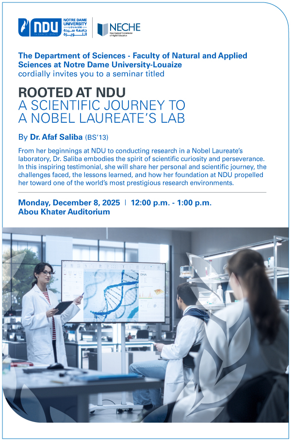 The Department of Sciences, Faculty of Natural and Applied Sciences at Notre Dame University-Louaize (NDU), cordially invites students and members of the academic community to a seminar by Dr. Afaf Saliba (BS ’13). Dr. Saliba’s journey, from her formative years at NDU to conducting research in a Nobel laureate’s laboratory, exemplifies the spirit of scientific curiosity, resilience, and perseverance. During this testimonial, she will recount her personal and professional trajectory, reflecting on the challenges encountered, the lessons learned, and the pivotal role that NDU played in equipping her with the foundation to excel in one of the world’s most prestigious research environments.