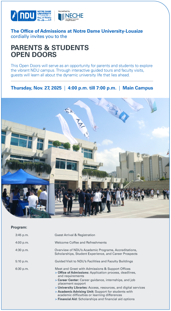 The Office of Admissions at Notre Dame University-Louaize (NDU) will host the Parents and Students Open Doors event on Thursday, November 27, 2025, from 4:00 p.m. to 7:00 p.m. at the Main Campus. This initiative aims to strengthen engagement between the University and prospective students and their families by offering a dynamic on-campus experience that highlights NDU’s academic excellence and student-centered environment.