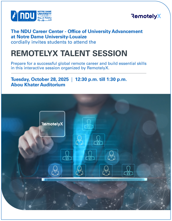 The NDU Career Center – Office of University Advancement at Notre Dame University-Louaize invites students to participate in the RemotelyX Talent Session, taking place on Tuesday, October 28, 2025, at the Abou Khater Auditorium from 12:30 p.m. to 1:30 p.m.