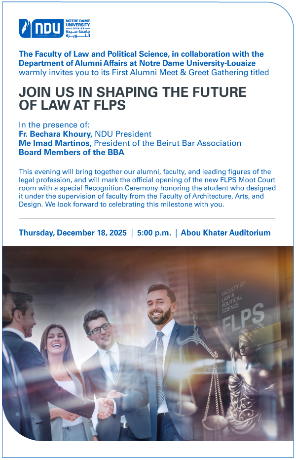 The Faculty of Law and Political Science (FLPS) at Notre Dame University-Louaize (NDU), in collaboration with the Department of Alumni Affairs, will host its inaugural Alumni Meet and Greet Gathering. Held in the presence of Fr. Bechara Khoury, President of NDU; Me Imad Martinos, President of the Beirut Bar Association; and members of the BBA Board, this event will convene alumni, faculty, and distinguished figures of the legal profession.