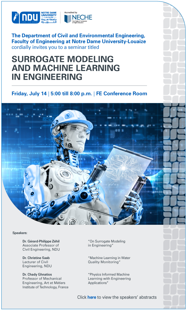 The Department of Civil and Environmental Engineering, Faculty of Engineering at Notre Dame University-Louaize (NDU), cordially invites you to a seminar titled "Surrogate Modeling and Machine Learning in Engineering." The seminar will be held on Friday, July 14, 2023, from 5:00 p.m. till 8:00 p.m. in the FE Conference Room.