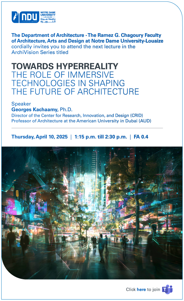The Department of Architecture at the Ramez G. Chagoury Faculty of Architecture, Arts, and Design at Notre Dame University-Louaize (NDU) presents Towards Hyperreality, a thought-provoking lecture in the esteemed ArchiVision series. This session will explore the transformative impact of immersive technologies on the future of architecture.