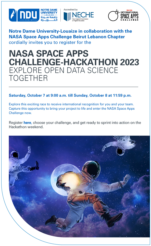 Join us for an exciting interstellar journey at the NASA Space Apps Hackathon from October 7th to 8th, hosted by Notre Dame University-Louaize (NDU) in collaboration with the NASA Space Apps Challenge Beirut Lebanon Chapter. This is your chance to gain global recognition for your visionary project.