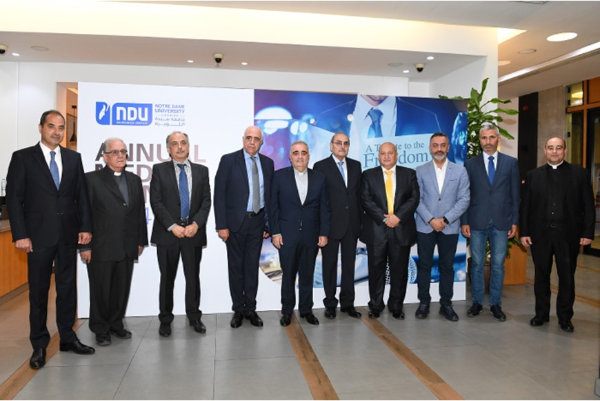Amid a year marked by severe challenges for the Lebanese press, Notre Dame University-Louaize (NDU) hosted its annual media dinner to honor the relentless efforts of journalists and to pay tribute to those who have lost their lives in the pursuit of truth. The event, which also celebrates the University’s founding, drew the presence of NDU President Father Bechara El Khoury, as well as the participation of distinguished guests and celebrated media figures. Among the attendees present were His Excellency the Minister of Information Ziad Makary; H.E. Bishop Antoine Nabil Andari, Head of the Episcopal Commission for media outlets; Albert Chamoun, representing H.E. the Minister of Education and Higher Education Judge Abbas Al-Halabi; Joseph al-Qosaifi, Head of the Syndicate of Press Editors; Rafik Shalala, Director of the Information Office at the Presidential Palace; H.E. Fr. Abdo Abou Kassem, Head of the Catholic Media Centre; Jack El Kallassi, General Manager at Télé Lumière and Noursat media network; Brigadier General Hussein Ghaddar, Director of Orientation in the Lebanese Army; Lieutenant Colonel Chadi Aoun, representing Brigadier General Elie Al-Deek, Director of the Media Division at the General Directorate of State Security; and Dr. George Harb, Media Advisor to the Director General of State Security.
