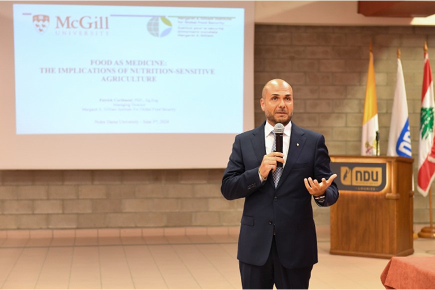 Within its efforts to introduce and promote nutrition-sensitive agriculture in the educational sector, the Faculty of Nursing and Health Sciences (FNHS) and the Lifelong Learning Center (LLC) at Notre Dame University-Louaize (NDU) launched an enriching workshop titled ‘Food as Medicine’. The informative event featured the presence of NDU President Father Bechara Khoury, FNHS Dean Dr. Jessy El Hayek, Major General Muhammad Al-Mustafa, President of the Food Safety Lebanese Commission Elie Awad, Representative of the Minister of Agriculture Dr. Salem Darwish, Representative of the Lebanese Ministry of Agriculture Sylvana Gerges, Representative of the Director General of the Ministry of Economy and Trade Dr. Elie Bou Yazbeck, and Dr. Patrick Cortbaoui, Managing Director at the Margaret A. Gilliam Institute for Global Food Security at McGill University. FNHS Chairperson Dr. Maya Abou Jaoude also moderated the event and introduced the guests to the highly anticipated workshop.